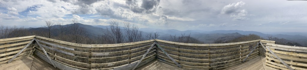 The trail descends from the Wayah ridge and then goes up and down all day. We ascended to Rocky Bald (I think there may be several mountains—well, “mountains”—with that name in the Appalachians). Then, after ascending and descending innumerable ridges and small hills, the trail climbs to Wesser bald, where there’s a fire tower with some very steep, precarious steps. I cooled off at the top after the long climb up to Wesser from Tellico Gap (which I’d just as soon call Jellico Gap). I sat at the base of the tower while Elena, who doesn’t much like heights, made her way carefully down the stairs. A trail runner was there with her very eager young golden (I think—it was some breed like that). The dog (Ruby) followed me up the ridge to the fire tower when I arrived, seeming to say to her owner, “I’m an AT dog now!” I took some photos from the top of the tower.