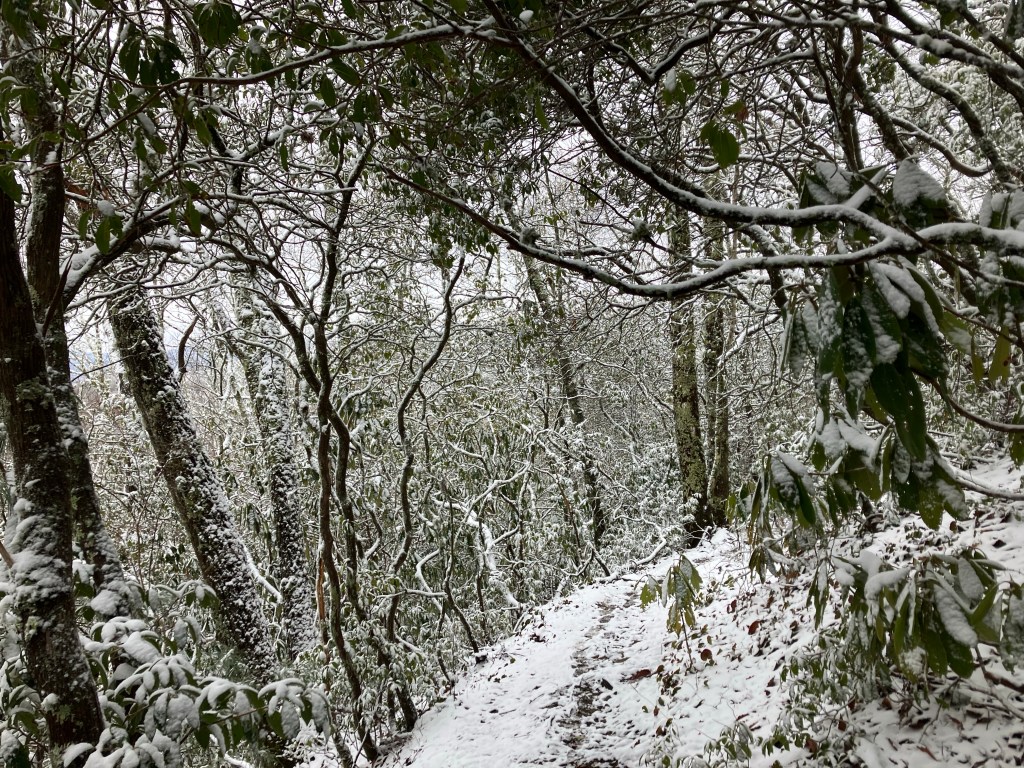 When I emerged from the tent, I discovered that it hadn’t been raining! It was snow all the time. It totally covered my tent. That’s why it was so dark this morning—my tent had an extra layer to darken it! This is an unexpected wrinkle. Hate to think what this weather did to folks in the Smokies. Parts of the tent froze rigid.