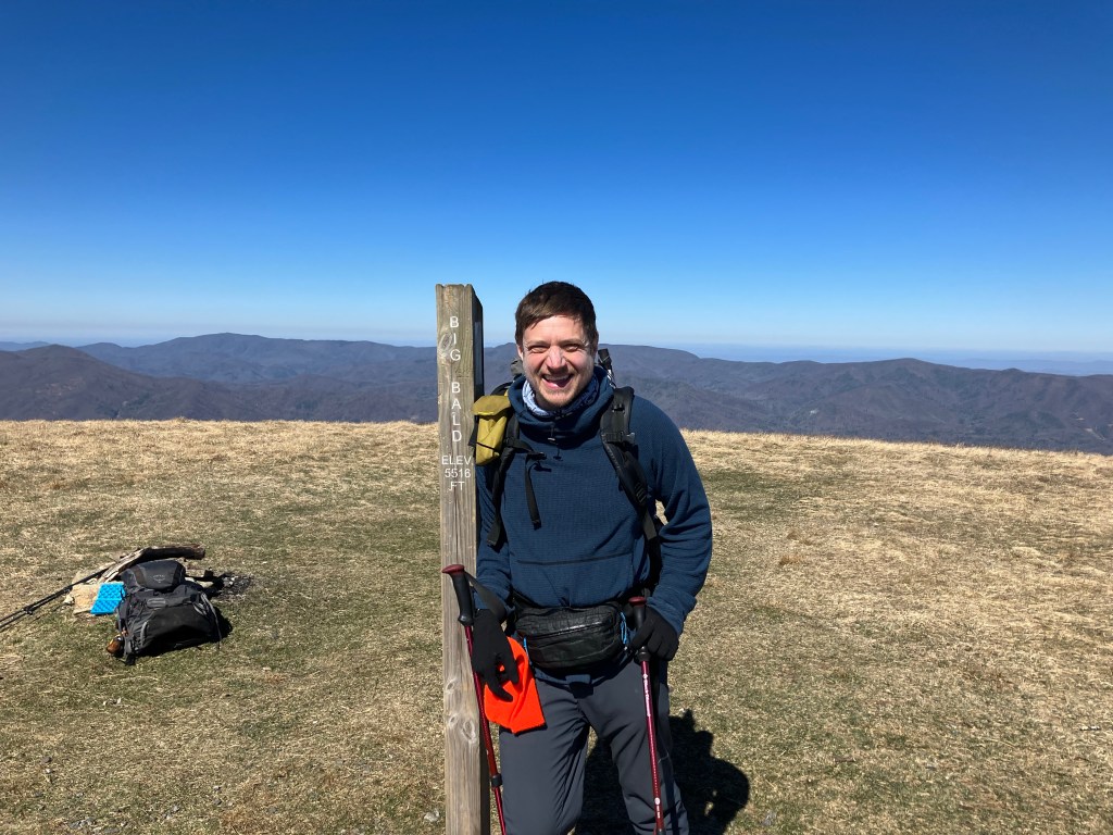 Our packs were light. Wedge decided to try my languid hiking pace to see if it’s easier on a sore leg. He kept saying, “I’m going slow today” and I pointed out, with some umbrage, that “I am hiking my normal pace, which is normal and not slow, thank you.” But the conversation was great—very real and personal and open. We caught up with L&F on Big Bald, which was windy. The ground was in the sun so the frozen mud had well and truly thawed and became slippery as hell. We saw Callie the collie up there. She looked tired.