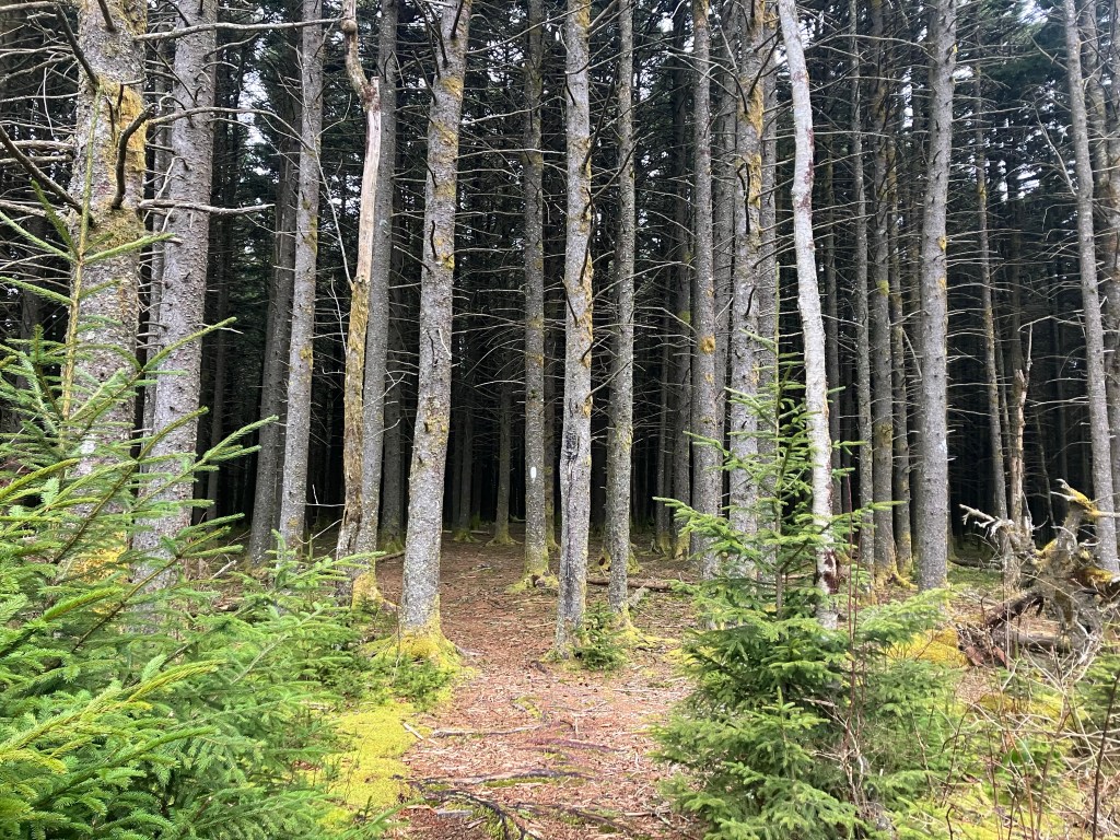 The pines at the peak of Unaka Mountain cluster so tightly that their collective shadow looms over the path. It looks as though you’re walking into the dark.